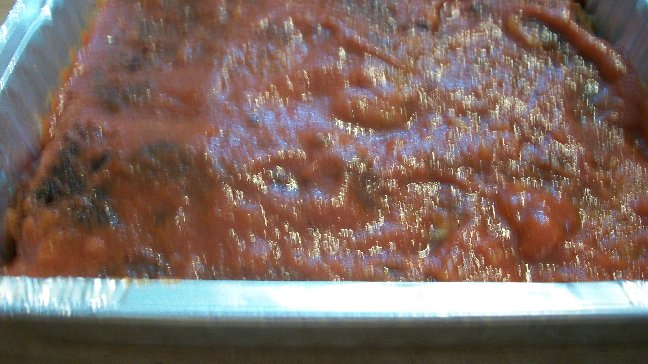 Then I spread another layer of the spaghetti sauce on top of the slices.