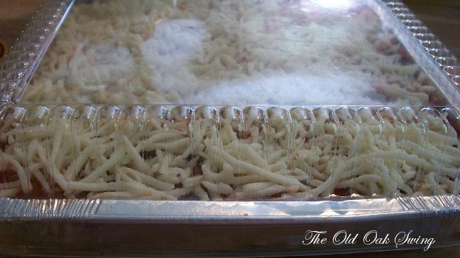 Then I top the spaghetti sauce with shredded Mozzarella Cheese.